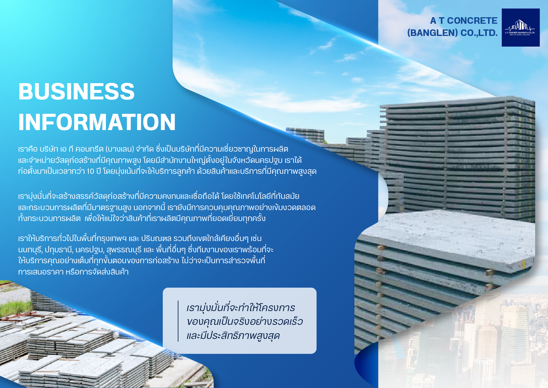 เราคือ "บริษัท เอ ที คอนกรีต (บางเลน) จำกัด" ซึ่งเป็นบริษัทที่มีความเชี่ยวชาญในการผลิตและจำหน่ายวัสดุก่อสร้างที่มีคุณภาพสูง โดยมีสำนักงานใหญ่ตั้งอยู่ในจังหวัดนครปฐม เราได้ก่อตั้งมาเป็นเวลากว่า 10 ปี โดยมุ่งมั่นที่จะให้บริการลูกค้าด้วยสินค้าและบริการที่มีคุณภาพสูงสุด
